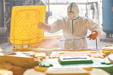 新冠肺炎疫情发生后,,每天产生的巨量医疗废物成为武汉市亟待解决的重要问题。。。。图为近日,,,在武汉市青山区云峰公司,,工作人员在对医疗废物转运箱消毒。。。。新华社记者 才扬 摄3月11日,,记者从国务院联防联控机制新闻发